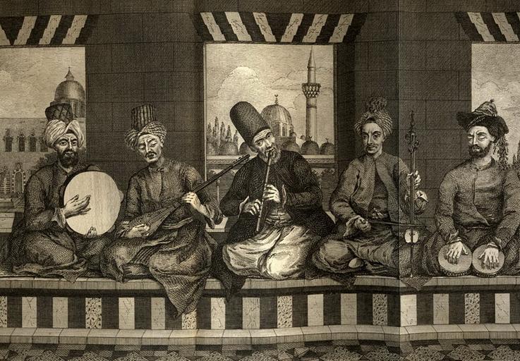 | Keywords: Aleppomusic.jpg Syrian music band from Ottoman Aleppo mid 18th century by Alex Russel M D 1794 The Chamber Music drawn from life as described by Russel the first is a Turk of lower class he beats the Diff Daff The person next to him is an ordinary Christian and plays the Tanboor The middle figure is a Dervish he is playing the Naie Nay The fourth is a Christian of middle rank he plays the Kamangi The last man he beats the Nakara with his fingers in order to soften the the sound for the voice but the drum sticks appear from under his vest http //mideastimage com/result aspx mid 18th century author PD-Syria Aleppo in the 18th century Music of Syria Music of the Ottoman Empire 18th-century art Sitting men in art Frame drums Dafs String instrumentalists in art Tanbur Kamangi Kamancheh Wind instrumentalists in art Ney Percussionists in art Nagara drum Drums in art |