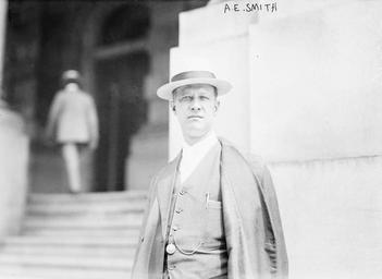 | Keywords: AlESmithBainStrawBoater1913.jpg A E Smith Speaker of the New York State Assembly Alfred E Smith in 1913 Smith appears to be standing in front of the steps of the State Capitol in Albany New York He is wearing a straw boater suit with jacket and vest watch on chain Bain News Service photo via Library of Congress website http //hdl loc gov/loc pnp/ggbain 13830 1913 Unnamed photographer for G G Bain Photo Service PD-Bain Al Smith Fashion in 1913 1913 in New York Straw boaters Three-piece suits |