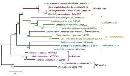 | Keywords: Aleurocystidiellum-Minimum Evolution.png Figure Evolutionary relationships of Aleurocystidiellum<br /> Minimum Evolution Tree of Genus Aleurocystidiellum ribosomal RNA gene 5 8S partial ITS-2 28S partial The evolutionary history was inferred using the Minimum Evolution method The optimal tree with the sum of branch length 0 32675511 is shown The confidence probability multiplied by 100 that the interior branch length is greater than 0 as estimated using the bootstrap test 1000 replicates is shown next to the branches The tree is drawn to scale with branch lengths in the same units as those of the evolutionary distances used to infer the phylogenetic tree The evolutionary distances were computed using the Maximum Composite Likelihood method and are in the units of the number of base substitutions per site The ME tree was searched using the Close-Neighbor-Interchange CNI algorithm at a search level of 2 The Neighbor-joining algorithm was used to generate the initial tree The analysis involved 19 nucleotide sequences All positions with less than 95 site coverage were eliminated That is fewer than 5 alignment gaps missing data and ambiguous bases were allowed at any position There were a total of 843 positions in the final dataset Evolutionary analyses were conducted in MEGA5 Phylogenetic and molecular evolutionary analyses were conducted using http //www megasoftware net/ MEGA version 5 Tamura Peterson Peterson Stecher Nei and Kumar 2011 All sequences were obtained from the Genbank and were aligned by the Muscle algorithm with standard settings <br /> List of the GenBank Sequences http //www ncbi nlm nih gov/nuccore/AF506402 Aleurocystidiellum disciforme - AF506402 http //www ncbi nlm nih gov/nuccore/AY039329 Aleurocystidiellum disciforme strain T629 http //www ncbi nlm nih gov/nuccore/AF506403 Aleurocystidiellum subcruentatum - AF506403 http //www ncbi nlm nih gov/nuccore/AJ406497 Aleurodiscus scutellatus - AJ406497 http //www ncbi nlm nih gov/nuccore/AF506450 Gloiodon nigrescens - AF506450 http //www ncbi nlm nih gov/nuccore/AF506419 Lentinellus ursinus strain EL73-97 http //www ncbi nlm nih gov/nuccore/AF506415 Lentinellus auricula strain KGN280994 http //www ncbi nlm nih gov/nuccore/AF506417 Lentinellus cochleatus strain KGN960928 http //www ncbi nlm nih gov/nuccore/AF506472 Scytinostromella nannfeldtii strain NH7476 http //www ncbi nlm nih gov/nuccore/AY048877 Gloeocystidiellum bisporum - AY048877 http //www ncbi nlm nih gov/nuccore/AF310088 Gloeocystidiellum clavuligerum strain FCUG2159 http //www ncbi nlm nih gov/nuccore/AF506430 Echinodontium tinctorium - AF506430 http //www ncbi nlm nih gov/nuccore/DQ234539 Bondarzewia montana isolate AFTOL-ID 452 http //www ncbi nlm nih gov/nuccore/AF347096 Heterobasidion annosum - AF347096 http //www ncbi nlm nih gov/nuccore/AF506459 Hericium coralloides - AF506459 http //www ncbi nlm nih gov/nuccore/AF506385 Hericium cirrhatum - AF506385 http //www ncbi nlm nih gov/nuccore/AF506458 Hericium americanum - AF506458 http //www ncbi nlm nih gov/nuccore/JN710559 Junghuhnia micropora isolate X615 http //www ncbi nlm nih gov/nuccore/JQ700293 Postia placenta isolate 4004 own 2013-03-30 User thkgk Cc-zero Aleurocystidiellum |