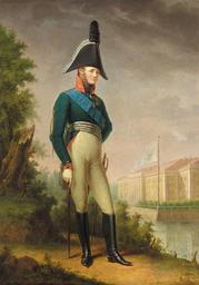 Keywords: Alexander I by S.Shchukin (1806, priv.coll).jpg STEPAN SEMIONOVICH SHCHUKIN 1758-1828 signed in Latin m l and dated 1806 oil on canvas PROVENANCE Acquired in 1807 for the first Earl of Malmesbury by his secretary James Tyrrell Ross White while employed in Lord Granville's Embassy at St Petersburg Private English Collection since 1987 LITERATURE AND REFERENCES Antoine Cheneviere Russian Furniture The Golden Age 1780-1840 Weidenfeld and Nicholson 1988 ill p 177 CATALOGUE NOTE This grand yet intimate cabinet portrait depicts Emperor Alexander I standing at ease in full army uniform of the Imperial Preobrazhensky Regiment In the background is Kammenostrovsky Island Palace built for the Tsar while he was still a boy to be his future St Petersburg residence His pose directly recalls the famous portrait of his father Emperor Paul I painted ten years previously by Shchukin see fig 1 The offered lot is said to be one of several similar versions one being in the State Hermitage Museum St Petersburg and another in the Queen ™s collection England Stepan Shchukin was an orphan who learned to draw while living in a hospice for homeless children in Moscow in the mid 1760s Despite these humble beginnings a combination of talent and effort earned him a place at the Imperial Academy of Arts in St Petersburg where he studied portraiture under Dmitri Levitsky There he won a scholarship to continue his studies in Paris from 1782-6 where he received further instruction from the court painter Alexander Roslin He returned to Russia in 1786 and within two years took over from his former tutor as head of the portraiture department at the Academy In 1797 he became a full member for his portrait of Paul I fig 1 From 1804-1812 he worked together with his contemporary Borovikovsky on the interior decoration of the Kazan Cathedral in St Petersburg He is considered to be after Levitsky and Borovikovsky one of the best portraitists in Russia of his time and fostered a new generation in his wake including Vasili Tropinin and Orest Kiprensky Kamennostrovsky Palace was designed by the architect Georg Friedrich Velten 1730-1801 one among many foreign architects who were summoned to the capital by Catherine the Great in the 18th century see fig 2 Velten had re-designed the interiors of the Peterhof Palace for Catherine the Great in the 1770s and with the conclusion of Russo-Turkish war in 1774 he was commissioned to build a palace commemorating the Russian naval victory over the Turks at Chesme Bay in 1770 The offered painting belonged to the distinguished English diplomatist Sir James Harris the first Earl of Malmesbury It was his period of service in Russia that established him as a diplomat of the highest distinction after he successfully navigated the diplomatic storms of the Northern Accord a costly campaign aggressively pursued in particular by one of Catherine the Great ™s advisors Count Nikita Panin whose career was eventually brought down as a consequence Emperor Alexander I visited Sir James Harris at his residence in Henley during a trip to England in 1814 http //www sothebys com/en/auctions/ecatalogue/2005/the-russian-sale-l05110/lot 1 html 1806 STEPAN SEMIONOVICH SHCHUKIN Alexander I of Russia by Shchukin Alexander I in bicorne Files uploaded by Shakko from various sources Private collections of Russian art Images from Sotheby's PD-old-100