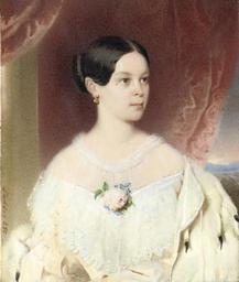 | Keywords: Alexandra Iosifovna by T.Mayer (priv.coll.).jpg Grand Duchess Alexandra Iosifovna 1830-1911 in white dress with large lace collar pink rose and blue flowers at corsage an ermine cloak over her left shoulder gold and pearl earring her dark hair swept back; window and crimson curtain background signed and dated 'Taddeo 850' lower left rectangular 4 5/8 x 3 15/16 in 118 x 100 mm gilt-metal mount within green velvet frame http //www christies com/lotfinder/paintings/fr-taddaus-mayer-grand-duchess-alexandra-iosif-5003564-details aspx from searchresults intObjectID 5003564 sid 31669af6-37c5-4b96-830b-b581248ba666 1850 FR TADDÄUS MAYER BOHEMIAN 1814-1856 Alexandra Iosifovna of Altenburg in portraits Files uploaded by Shakko from various sources Images from Christie's Private collections of Russian art Ermine clothing in art Thaddaus Mayer PD-old |