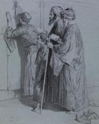 | Keywords: Alexandre Bida - Four Jews at the Wailing Wall - Walters 371392.jpg ca 1850 charcoal with white chalk highlights over graphite underdrawing on slightly textured moderately thick blue wove paper cm 29 9 23 7 accession number 37 1392 17136 William T Walters city Baltimore from the artist George A Lucas as agent Henry Walters city Baltimore Walters Art Museum Henry Walters Acquired by William T Walters 1865 Bida in graphite lower left; 40 in graphite upper right verso; 36 in graphite bottom edge verso The Essence of Line place of origin France Walters Art Museum license 2D The Essence of Line Alexandre Bida Jewish prayers in art Western Wall in art 1850 1850 drawings Charcoal drawings Drawings in the Walters Art Museum People at the Western Wall |