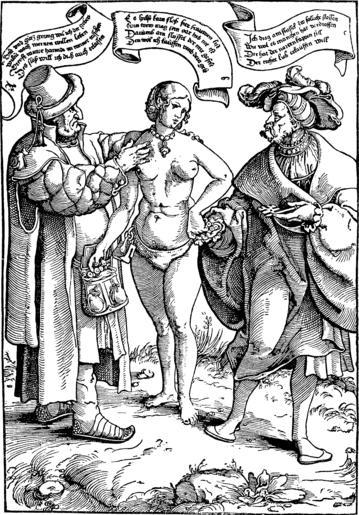 Keywords: Alfons luder kunde.gif A 16th-century ca 1540 German satirical print whose general theme is the uselessness of chastity belts in ensuring the faithfulness of beautiful young wives married to old ugly husbands The young wife is dipping into the bag of money which her old husband is offering to give her to encourage her to remain placidly in the chastity belt he has locked on her but she intends to use it to buy her freedom to enjoy her handsome lover who is bringing her a key For another closely-related 16th century woodcut with different artwork and the poem spelled according to a different German dialect but basically the same idea see Image 16thc-German-woodcut-Chastity-belt jpg Here's the transcript of the text in the woodcut which is provided in Eric John Dingwall's 1931 book The Girdle of Chastity thumb right Other version The old husband a Gelt und gütz gnung wil ich dir geben Wiltü nach meinen willen leben Greift mitter hannd in meiner tasschen Des sloss will ich dich auch erlassen His young wife b Es hilft kain shloß für frauwen list kain trew mag sein dar lieb nit ist Darumb ain slüssel der mir gefelt Den wöl ich kauffen umb dein gelt Her lover c Ich drag ein Slüssel zw solliche slossen Wie wol es manchen hat verdrossen Der hat der narren kappen fill Der rechte lieb erkäuffen will Here's an attempted rendering of this text into modern German Geld und Güter genug will ich dir geben willst du nach meinem Willen leben Greif mit der Hand in meine Tasche das Schloss will ich dir erlassen Es hilft kein Schloss vor der Frauen List keine Treue kann sein wo Liebe nicht ist Darum einen Schlüssel der mir fehlt den will ich kaufen um für dein Geld Ich trage einen Schlüssel zu diesem Schloss obwohl es manchen verdrossen hat Der hat der Narrenkappe viel der rechte Liebe erkaufen will Dingwall translates what the wife says as No lock is of avail against the cunning of women; there can be no fidelity where love is not present for that reason will I buy with your money the key I lack This print has been attributed to Peter Flötner and Hans Baldung but Dingwall prefers to attribute it to H Vogtherr however it is not entirely clear to me whether Dingwall is referring to this version or to the alternative version Image 16thc-German-woodcut-Chastity-belt jpg fr Ceinture de chasteté Caricature allemande de la Renaissance avec un mari vieilli riche une jeune épouse ceinturée rétive et un bel amant Scanning source From Karikatur-album C E Jensen MDCCCCVI For a completely different Renaissance chastity-belt caricature though expressing the same basic sentiments see File Chastity belt satire jpg Note that historically the use of chastity belts was a Renaissance phenomenon not actually medieval PD-old-100 Female chastity devices Money in art Topless standing women in art Moneybags 16th-century etchings Artworks missing infobox template |