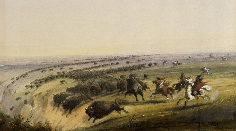 | Keywords: Alfred Jacob Miller - Hunting Buffalo - Walters 371940190.jpg It is true that various Plains Indians would occasionally chase buffalo over a small cliff but Miller probably never saw this scene and therefore exaggerated it a bit The Indians when they found a suitable bluff would conceal themselves behind the rocks with hides When the herd would start to move towards the bluff the Indians would jump up from behind their rocks shouting and waving the hides keeping the buffalo moving toward the cliff In later versions of this picture Miller exaggerated the cliff even more Had the Indians driven buffalo over such precipices the meat would have been too badly smashed to eat and the bones would have been broken between 1858 1860 watercolor paper cm 21 1 36 accession number 37 1940 190 16002 William T Walters Baltimore 1858-1860 by commission Henry Walters city Baltimore Walters Art Museum Henry Walters Commissioned by William T Walters 1858-1860 Alfred Jacob Miller An Artist on the Oregon Trail Alfred Jacob Miller Maryland and the West The Walters Art Gallery Baltimore; Frostburg State University Frostburg; Jewish Community Center of Greater Washington Rockville; Washington College Chestertown 1988 place of origin USA Walters Art Museum license 2D Alfred Jacob Miller An Artist on the Oregon Trail 19th-century watercolor paintings in the United States Bisons in art Buffalo jumps Horses of Native Americans in art Hunting by horse in paintings Paintings of Native Americans by Alfred Jacob Miller Paintings by Alfred Jacob Miller in the Walters Art Museum |