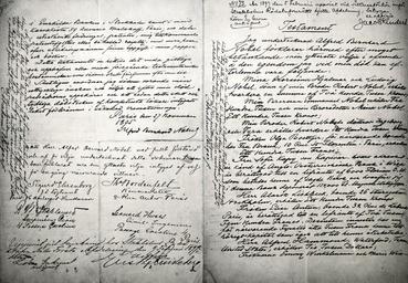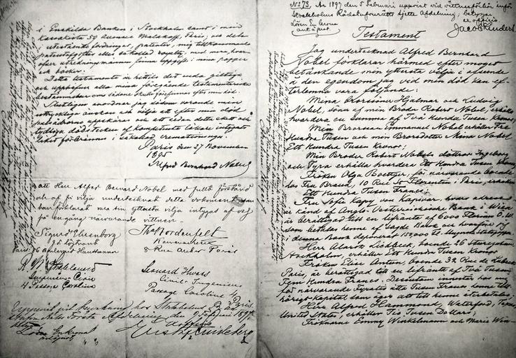 | Keywords: Alfred Nobels will-November 25th, 1895.jpg Alfred Nobels last will dated november 27th 1895 Alfred Nobels letztes Testament vom 27 November 1895 Alfred Nobels sista testamente från den 27 november 1895 Alfred Nobel 2008-12-05 Photograph Prolineserver <span class signature-talk >talk</span> <br>Document Alfred Nobel <span class plainlinks >PD-Art in Sweden</span> <br/> Under http //www sweden gov se/download/129882cd pdf major 1 minor 12248 cn attachmentDuplicator_1_attachment Article 49 a anyone who has produced a photographic picture has an exclusive right to reproduce the picture and to make it available to the public This right subsists until 50 years have elapsed from the year in which the picture was produced Last Will and Testament of Alfred Nobel Transciption ;right hand side No 73 År 1897 den 5 Februari upprist vid vi Stockholms Rådstufvurätts Stjette Afdelning; bet ex officio aut Jacob Linders <big><u>Testament</u></big> Jag undertecknad Alfred Bernhard Nobel förklarar härmed efter moget betänkade min yttersta vilja i afseende å den egendom jag vid min död kan ef- terlemna vara följande Mina brorssöner Hjalmar och Ludvig Nobel söner af min Broder Robert Nobel erhålla hvardera en summa af Två Hundra Tusen Kronor; Min Brorsson Emmanuel Nobel erhåller Tre Hundra Tusen och min Brorsdotter Mina Nobel Ett Hundra Tusen Kronor; Min Broder Robert Nobels döttrar Ingeborg och Tyra erhålla hvardera Ett Hundra Tusen Kronor; Fröken Olga Boettger för närvarande boende hos Fru Brand 10 Rue St Florentin i Paris erhåller Ett Hundra Tusen Francs; Fru Sofie Kapy von Kapivar hvars adress är känd af Anglo-Oesterreichische Bank i Wien är berättigad till en lifränta af 6000 Floriner Ö W som betalas henne af sagde Bank och hvarföre sig i denna Bank deponerat 150 000 Fl Ungerska Statspapper Herr Alarik Liedbeck boende 26 Sturegatan Stockholm erhåller Ett Hundra Tusen Kronor; Fröken Elise Antun boende 32 Rue de Lubeck Paris är berättigad till en lifränta af Två Tusen Fem Hundra Francs Dessutom innestår hos mig för närvarande Fyratio åtta Tusen Francs henne till- hörigt Kapital som äger att till henne återbetalas; Herr Alfred Hammond Waterford Texas United States erhåller Tio Tusen Dollars; Fröknarna Emmy Winkelmann och Marie Winkel- <small> ;back side mann Potsdamerstrasse 51 Berlin erhålla hvardera Femtio Tusen Mark; Fru Gaucher 2 bis Boulevard du Viaduc Nîmes Frankrike erhåller Ett Hundra Tusen Francs; Mina tjenare Auguste Oswald hans hustru Alphonse Tournand anstäld vid mitt laboratorium i Sanremo erhålla hvardera en lifränta af Ett Tusen Francs; Mina förra tjenare Joseph Girardot 5 Place St Laurent Châlons sur Saône Frankrike äro berättigade till en lifränta af Fem Hundra Francs samt min förra trädgårdsmästare Jean Lecof hos Fru Desoutter receveur Curaliste Mesnil Aubry pour Ecouen S O Frankrike till en lifränta af Tre Hundra Francs Herr Georges Fehrenbach 2 Rue Compiègne Paris har rätt att lyfta en pens af Fem Tusen Franc årligen d 1 Januari till och med 1 Januari 1899 då den upphör Mina Brorsbarn Hjalmar Ludvig Ingeborg och Tyra hafva hvardera hos mig mot quitto innestående Tjugo Tusen Kronor som till dem återbetalas; Öfver hela min återstående realiserbara förmögenhet förfogas på följande sätt kapitalet af utredningsmännen realiserade till säkra värdepapper skall utgöra en fond hvars ränta årligen utdelas som prisbelöning åt dem som under det förlupne året hafva gjort menskligheten den största nytta Räntan delas i fem lika delar som tillfalla en del den som inom fysikens område har gjort den vigtigaste upptäckt eller uppfinning; en del den som har gjort den vigtigaste kemiska upptäck eller förbättring; en del den som har gjort den vigtigaste upptäckt inom fysiologiens eller medicinens domän; en del den som inom litteraturen har producerat det utmärktaste i idealisk rigtning; och en del åt den som har verkat mest eller best för folkens förbrödrande och afskaffande eller minskning af stående armeer samt bildande och spridande af fredskongresser Prisen för fysik och kemi utdelas af Svenska Vetenskapsakademien; för fysiologiska eller medicinska arbeten af Carolinska institutet i Stockholm; för litteratur af Akademien i Stockholm samt för fredsförfäktare af ett utskott af fem personer som väljas af Norska Stortinget Det är min uttryckliga vilja att vid prisutdelningarne intet afseende fästes vid någon slags nationalitetstillhörighet sålunda att den värdigaste erhåller priset antingen han är Skandinav eller ej Till Exekutorer af dessa mina testamentariska dispositioner förordnar jag Herr Ragnar Sohlman bosatt vid Bofors Vermland och Herr Rudolf Liljequist 31 Malmskillnadsgatan Stockholm och Bengtsfors i närheten av Uddevalla Som ersättning för deras omsorg och besvär tillerkänner jag Herr Ragnar Sohlman som antagligen kommer att egna mesta tid deråt Ett Hundra Tusen Kronor och Herr Rudolf Liljequist Femtio Tusen Kronor Min förmögenhet består för närvarande dels i fastigheter i Paris och San Remo; dels i värdepapper förvarade i Union Bank of Scotland Ld i Glasgow och London i Crédit Lyonnais Comptoir National d'Escompte och hos Alphen Messin Co i Paris; hos fondsmäklaren M V Peter fr Banque Transatlantique äfvenledes i Paris; hos Direction der Disconto Gesellschaft samt Joseph Goldschmidt Cie i Berlin; i Ryska Riksbanken samt hos Herr Emmanuel Nobel i Petersburg; i Skandinaviska Kreditaktiebolaget i Göteborg och Stockholm; </small> ;left hand side i Enskilda Banken i Stockholm samt i min Kassakista 59 Avenue Malakoff Paris; och dels i utestående fordringar patenter mig tillkommande patentafgifter eller såkallad royalty med mera hvar- öfver utredningsmännen finna uppgift i mina papper och böcker Detta testamente är hittills det enda giltiga och upphäfver alla mina föregående testamentariska bestämmelser om sådane skulle förefinnas efter min död Slutl