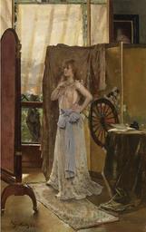 | Keywords: Alfred Stevens - L'Ètude du Rôle.jpg Artwork Creator Alfred Stevens 1888 Oil on canvas cm 94 59 Private collection unknown accession number object history credit line Sotheby's PD-old-100 Alfred Stevens 1888 People with mirrors in art Females with mirrors Cheval-glasses furniture 1888 paintings Folding screens in art Images from Sotheby's |