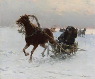 | Keywords: Alfred Wierusz-Kowalski - Karawana sań.jpg Artwork Creator Alfred Wierusz-Kowalski de Schlitten Karawane en Sledding caravan oil canvas cm 32 7 39 1 http //www sothebys com/de/ecat pdf N08355 html/f/11/N08355-11 pdf by Sotheby's PDF object history credit line signed A Wierusz Kowalski lower right accession number http //www sothebys com/de/catalogues/ecatalogue html/2007/19th-century-european-art-n08355 /r /de/ecat fhtml N08355 html+r m /de/ecat lot N08355 html/11/ Sotheby's PD-old-auto-1923 1917 Paintings by Alfred Wierusz-Kowalski Paintings of horse sleighs Images from Sotheby's |
