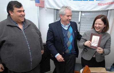 | Keywords: tacuarembo uruguay lloyd bnc alianza people suit El Encargado de Negocios de los EE.UU., Thomas Lloyd, realizó una visita a la Alianza Cultural Uruguay-Estados Unidos en Tacuarembó. Foto: la Agregada de Prensa y Cultura de la embajada, Susan Bridenstine, recibe un obsequio por parte del director de la Alianza, David Fontes. [U.S. Embassy photo by Vince Alongi / Copyright info] El Encargado de Negocios de los EE.UU., Thomas Lloyd, realizó una visita a la Alianza Cultural Uruguay-Estados Unidos en Tacuarembó. Foto: la Agregada de Prensa y Cultura de la embajada, Susan Bridenstine, recibe un obsequio por parte del director de la Alianza, David Fontes. [U.S. Embassy photo by Vince Alongi / Copyright info] |
