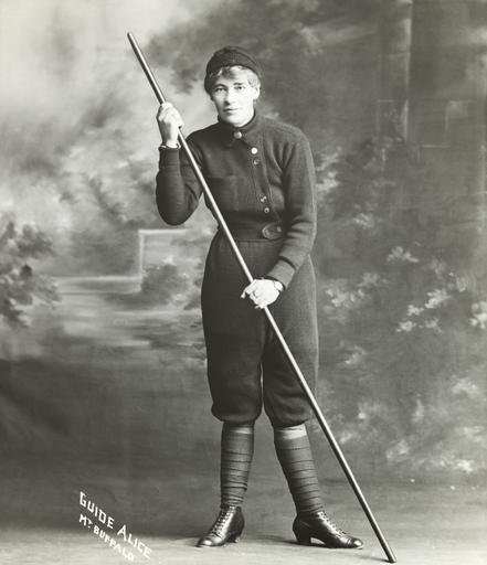 | Keywords: Alice Manfield - Guide Alice, Mt Buffalo, c1900-30, SLV.jpg Alice Manfield Guide Alice 1878-1960 mountain guide naturalist chalet owner photographer and early feminist figure based at Mt Buffalo Victoria Australia <br>In this image Alice is wearing custom made woollen clothing for hiking in the mountains and holding a long walking staff <br>Written on image lower left Guide Alice Mt Buffalo <br>Converted to digital from transparency glass lantern slide 8 5 cm x 8 5 cm Alice Manfield collection State Library of Victoria gift of Anne Shannon 2003 <br> http //handle slv vic gov au/10381/89404 Permalink to original; SLV holds a downloadable high-res TIFF version at this location <br>This version has been edited from the original by jjron straightened cropped black border and rough edges removed dust and scratches repaired cracked glass circa 1900 1930 Author The State Library of Victoria catalogue record details page states This work is out of copyright No copyright restrictions apply <br>Please contact them for other uses and credit them as original owner <br>This image is in the public domain due to its age <br> PD-old assessments 1 Alice Manfield Alice Manfield Mountaineers from Australia Black and white photographic portraits |