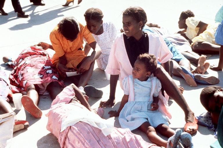 Keywords: ALIEN MIGRANT INTEDICTION OPERATIONS DVIDS1080554.jpg en Guatanomo Bay Cuba Dec 28 --Haitians rescued from sea sit on the pier at Guatanomo Bay Cuba awaiting processing USCG photo by PA2 Robin Ressler 1991-12-28 https //www dvidshub net/image/1080554 1080554 2013-12-11 18 56 GUANTANAMO BAY CU PD-USGov Guantanamo Bay Images from DoD uploaded by Fæ |