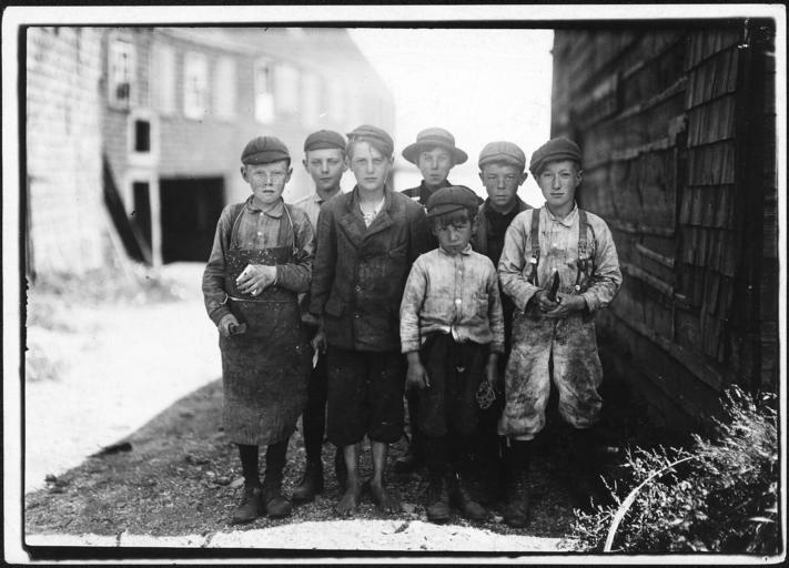 | Keywords: All these boys are cutters in a Canning Co. - NARA - 523450.jpg Scope and content All these boys are cutters in a Canning Co Ages range from 7 to 12 They live near the factroy 7 year old boy in front Byron Hamilton has a badly cut finger but helps his brother regularly Behind him is his brother George 11 years old He cut his finger half off while working They and many youngsters said they were always cutting themselves George earns a 1 some days usually 75 cents Some of the others say they earn a 1 when they work all day At times they start at 7 A M work all day until midnight but the work is very irregular Eastport Me General notes 523450 Local identifier 102-LH-2420 Department of Commerce and Labor Children's Bureau 1912 - 1913 NARA-Author Hine Lewis Wickes 1874-1940 Photographer 1122914 <br /> Still Picture Records Section Special Media Archives Services Division NWCS-S National Archives at College Park 8601 Adelphi Road College Park MD 20740-6001 1911-08-12 Record group Record Group 102 Records of the Children's Bureau 1908 - 2003 Record group ARC 431 National Child Labor Committee Photographs taken by Lewis Hine compiled ca 1912 - ca 1912 documenting the period 1908 - 1912 Series ARC 523064 File unit File unit ARC Variant control numbers NAIL Control Number NWDNS-102-LH-2420 Other versions <gallery> File All_these_boys_are_cutters_in_a_Canning_Co _-_NARA_-_523450 tif tif File All_these_boys_are_cutters_in_a_Canning_Co _-_NARA_-_523450 jpg jpg </gallery> NARA-cooperation PD-USGov Child labor in the United States |