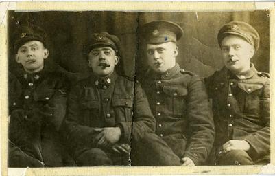 | Keywords: monochrome ancient photo border Description: Photo postcard of four men in World War I uniforms. Members of B Company, 161st Battalion. Object ID : 2007.0062.194 Order a higher-quality version of this item by contacting the Huron County Museum (fee applies). Description: Photo postcard of four men in World War I uniforms. Members of B Company, 161st Battalion. Object ID : 2007.0062.194 Order a higher-quality version of this item by contacting the Huron County Museum (fee applies). | ||||