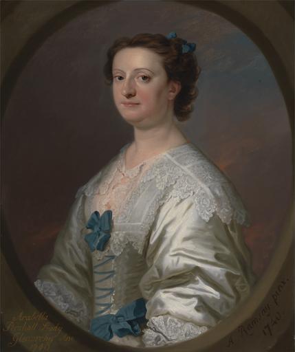 | Keywords: Allan Ramsay - Arabella Pershall, Lady Glenorchy - Google Art Project.jpg Inscribed lower left Arabella Pershall Lady Glenorchy Ano 1740 ; lower right Arabell<a> Inscription _Signed_and_Dated Signed and dated upper left A Ramsay pinx 1740 Not on View Oil on canvas Pershall Arabella oval noble aristocrat woman ribbon silk textile lace collar sleeves leg of mutton costume dress gown portrait special url_id SQGf1owFU-yccA PD-old-100-1923 1784 Google Art Project works by Allan Ramsay DEFAULTSORT 1740; Lady Glenorchy by Ramsay Allan Ramsay artist 18th-century portrait paintings in the Yale Center for British Art 1740 oil on canvas paintings in the United States Portrait 1740 portrait paintings from Great Britain 18th-century oil oval portraits of women at half length Paintings with years of production artist Portraits with sky background Three-quarter view painted portraits of women facing left |