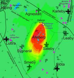 | Keywords: Ålleberg på Falbygden karta.jpg en Map over Ålleberg a table-mountain in the Falbygden area in Västergötland Sweden The mountain i situated SW of Falköping and is surrounded by the parishes Falköpings östra Karleby Slöta and Luttra wich together form Ålleberg's farthing quarter of Vartofta hundred It nowadays belong to Falköpings municipality in Västra Götaland Scale 1 20 000 Topography Altitude is shown with different colours from green over yellow to red The equidistance is 10 m Green hues are under 280 meter above sea-level Yellow 280-290 meter Orange yellow 290-300 meter Orange 300-310 meter Orange red 310-320 meter Red 320-330 meter Scarlet red is above 330 meter Agnestadssjön and other pound are blue Churches The churches of Luttra Slöta and Karleby parishes are marked with black crosses The churchruins of Agnestad Leaby Saleby and Smeby and the approximate place for the mediaeval Synnerål church are marked with grey crosses All these churches was probably churches in their own parishes during the Mediaeval period and together they formed Ålleberg's farthing Raiway roads and landingsstrip is marked grey Villages and farms are marked grey Archaeology Passage graves from the Middle Neolithic are marked with magneta T-shaped symbols A violet ring marks the finding-place for the Migration period golden collar called Ållebergskragen sv Karta över Ålleberg som är ett platåberg på Falbygden i Västergötland Sverige Berget ligger sydöst om Falköping och omges av socknarna Falköpings östra Karleby Slöta och Luttra vilka tillsammans utgör Ållebergs fjärding av Vartofta härad I modern indelning tillhör berget Falköpings kommun i Västra Götaland Skala 1 20 000 Topografi Höjden över havet visas med olika färger från grönt över gult till rött Ekvidistans 10 m Gröna toner är under 280 m ö h Gult är 280-290 m ö h Orangegult 290-300 m ö h Orange 300-310 m ö h Orangerött 310-320 m ö h Rött 320-330 m ö h Vinrött är över 330 m ö h Vatten Agnestadssjön och andra dammar är blå Kyrkor Kyrkorna i Luttra Slöta och Karleby är markerade med svarta kors Kyrkoruinerna Agnestad Falköpings östra sockens kyrka Leaby Saleby och Smeby samt den ungefärliga läget för Synneråls kyrka är markerade med grå kors Alla dessa kyrkor har troligen varit sockenkyrkor i socknar i Ållebergs fjärding Järnväg vägar och landningsbana är markerade i gråtoner Tätbebyggelse byar gårdar och stora byggnader är markerade i gråtoner Fornminnen Mellanneolitiska gånggrifter är markerade med magenta-färgade T-lika symboler Fyndplatsen för den folkvandringstida guldhalskragen Ållebergskragen är markerad med en violett ring own Gunnar Creutz Achird 2010-07-09 Ålleberg Maps by User Achird Public domain files by Gunnar Creutz |