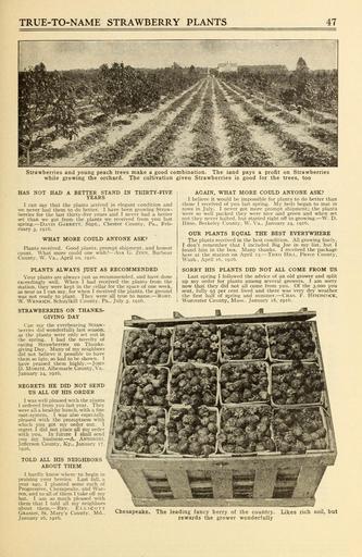 | Keywords: Allen's book of berries (15770326513).jpg TRUE-TONAME STRAWBERRY PLANTS <br> 47 <br> Strawberries and young peach trees make a good combination The land pays a profit on Strawberries <br> while growing the orchard The cultivation given Strawberries is good for the trees too <br> HAS NOT HAD A BETTER STAND IN THIRTY-FIVE <br> YEARS <br> I can say that the plants arrived in elegant condition and <br> we never had them to do better I have been growing Straw- <br> berries for the last thirty-five years and I never had a better <br> set than we got from the plants we received from you last <br> spring Davis Garrett Supt Chester County Pa Feb- <br> ruary 3 1916 <br> WHAT MORE COULD ANYONE ASK <br> Plants received Good plants prompt shipment and honest <br> count What more could one wish Asa G Zinn Barbour <br> County \V Va April 10 1916 <br> PLANTS ALWAYS JUST AS RECOMMENDED <br> Your plants are always just as recommended and have done <br> exceedingly well When I had received the plants from the <br> station they were kept in the cellar for the space of one week <br> as near as I can say for when I received the plants the ground <br> was not ready to plant They were all true to name Robt <br> W Wenrich Schuylkill County Pa July 3 1916 <br> STRAWBERRIES ON THANKS- <br> GD7ING DAY <br> Can say the everbearing Straw- <br> berries did wonderfully last season <br> as the plants were only set out in <br> he spring I had the novelty of <br> eating Strawberries on Thanks- <br> giving Day Many of my neighbors <br> did not believe it possible to have <br> them so late so had to be shown 1 <br> have praised them highly John <br> D Moritz Albemarle County Va <br> January 24 1916 <br> REGRETS HE DID NOT SEND <br> US ALL OF HIS ORDER <br> I was well pleased with the plants <br> I ordered from you last year They <br> were all a healthy bunch with a fine <br> root-system I was also especially <br> pleased with the promptness with <br> which you got my order out I <br> regret I did not place all my order <br> with you In future I shall send <br> you my business A Aktonini <br> Jefferson County Ky January 17 <br> 1916 <br> TOLD ALL HIS NEIGHBORS ' <br> ABOUT THEM <br> I hardly know where to begin in <br> praising your berries Last fall a <br> year ago I planted some each of <br> Progressive Chesapeake and War- <br> ren and to all of them I take off my <br> hat I am so much pleased with <br> them that I told all my neighbors <br> about them Rev Ellicott <br> Grason St Mary's County Md <br> January 16 1916 <br> AGAIN WHAT MORE COULD ANYONE ASK <br> I believe it would be impossible for plants to do better than <br> those I received of you last spring My beds began to mat in <br> rows in July I never got more prompt shipment; the plants <br> were so well packed they were nice and green and when set <br> out they never halted but started right off to growing W D <br> Hess Berkeley County W Va January' 24 1916 <br> OUR PLANTS EQUAL THE BEST EVERYWHERE <br> The plants received in the best condition All growing finely <br> I don't remember that I included Big Joe in my list but I <br> found him in the box Many thanks I received the package <br> here at the station on April 15 Theo Hill Pierce County <br> Wash April 16 1916 <br> SORRY HIS PLANTS DLD NOT ALL COME FROM US <br> Last spring I followed the advice of an old grower and split <br> up my order for plants among several growers I am sorry <br> now that they did not all come from you Of the 3 000 you <br> sent fully 95 per cent lived and there was very dry weather <br> the first half of spring and summer Chas F Hitchcock <br> Worcester County Mass January' 18 1916 <br> Chesapeake <br> The leading fancy berry of the country Likes rich soil but <br> rewards the grower wonderfully 43767903 148699 77584 Page 47 Text http //www biodiversitylibrary org/page/43767903 1917 10 5962/bhl title 77584 Allen Co Salisbury Md ; Henry G Gilbert Nursery and Seed Trade Catalog Collection NameFound Aktonini Biodiversity Heritage Library Allen's book of berries 1917 Garden Stories Allen Co Salisbury Md Catalogs Maryland Nurseries Horticulture Nursery stock Salisbury Strawberries U S Department of Agriculture National Agricultural Library bhl page 43767903 dc identifier http //biodiversitylibrary org/page/43767903 bhlGardenStories BHLinbloom allen co salisbury md nurseries horticulture u s department of agriculture national agricultural library bhlgardenstories bhlinbloom Information field Flickr posted date ISOdate 2015-01-28 Check categories 2015 August 24 CC-BY-2 0 BioDivLibrary https //flickr com/photos/61021753 N02/15770326513 2015-08-24 06 53 44 cc-by-2 0 PD-old-70-1923 Allen's book of berries Photos uploaded from Flickr by FĂŚ using a script |