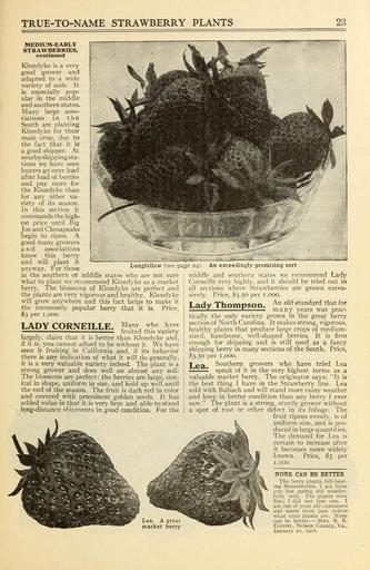 | Keywords: Allen's book of berries (16389350932).jpg TRUE-TONAME STRAWBERRY PLANTS <br> 23 <br> MEDIUM-EARLY <br> STRAWBERRIES <br> continued <br> Klondyke is a very <br> good grower and <br> adapted to a wide <br> variety of soils It <br> is especially pop- <br> ular in the middle <br> and southern states <br> Many large asso- <br> ciations in the <br> South are planting <br> Klondyke for their <br> main crop due to <br> the fact that it is <br> a good shipper At <br> nearby shipping sta- <br> tions we have seen <br> buyers go over load <br> after load of berries <br> and pay more for <br> the Klondyke than <br> for any other va- <br> riety of its season <br> In this section it <br> commands the high- <br> est price until Big <br> Joe and Chesapeake <br> begin to ripen A <br> good many growers <br> and associations <br> know this berry <br> and will plant it <br> anyway For those <br> in the southern or middle states who are not sure <br> what to plant we recommend Klondyke as a market <br> berry The blossoms of Klondyke are perfect and <br> the plants are very- vigorous and healthy Klondyke <br> ˘will grow anywhere and this fact helps to make it <br> the immensely popular berry that it is Price <br> 3 per 1 000 <br> LADY CORNEILLE p n \ TT ho h 3ve <br> fruited this variety <br> largely claim that it is better than Klondyke and <br> if it is you cannot afford to be without it We have <br> seen it fruiting in California and if its behavior <br> there is any indication of what it will do generally <br> it is a very valuable variety indeed The plant is a <br> strong grower and does well on almost any soil <br> The blossoms are perfect ; the berries are large con- <br> ical in shape uniform in size and hold up well until <br> the end of the season The fruit is dark red in color <br> and covered with prominent golden seeds It has <br> added value in that it is very firm and able to stand <br> long-distance shipments in good condition For the <br> Longfellow see page 24 An exceedingly promising sort <br> middle and southern states we recommend Lady <br> Corneille very highly and it should be tried out in <br> all sections where Strawberries are grown exten- <br> sively Price S3 50 per 1 000 <br> Lady Thompson An 0 d stand ard that f°r <br> - r many years was prac- <br> tically the only variety grown in the great berry <br> section of North Carolina It makes strong vigorous <br> healthy plants that produce large crops of medium- <br> sized handsome well-shaped berries It is firm <br> enough for shipping and is still used as a fancy <br> shipping berry in many sections of the South Price <br> S3 50 per 1 000 <br> Lea Southern growers who have tried Lea <br> - speak of it in the very highest terms as a <br> valuable market berry The originator says It is <br> the best thing I have in the Strawberry line Lea <br> sold with Bubach and will stand more rainy weather <br> and keep in better condition than any berry I ever <br> saw The plant is a strong sturdy grower without <br> a spot of rust or other defect in its foliage The <br> fruit ripens evenly is of <br> uniform size and is pro- <br> duced in large quantities <br> The demand for Lea is <br> certain to increase after <br> it becomes more widely <br> known Price S3 per <br> 1 000 <br> NONE CAN BE BETTER <br> The berry plants fall-bear- <br> ing Strawberries I got from <br> you last spring did wonder- <br> fully well The plants were <br> fine; I did not lose one I <br> am one of your old customers <br> and know from past orders ˘ <br> what your plants are None <br> can be better ” Mrs B B <br> Daniel Nelson County Va <br> January 20 1016 43767879 148699 77584 Page 23 Text http //www biodiversitylibrary org/page/43767879 1917 10 5962/bhl title 77584 Allen Co Salisbury Md ; Henry G Gilbert Nursery and Seed Trade Catalog Collection NameFound None NameConfirmed None EOLID 2913255 Biodiversity Heritage Library Allen's book of berries 1917 Garden Stories Allen Co Salisbury Md Catalogs Maryland Nurseries Horticulture Nursery stock Salisbury Strawberries U S Department of Agriculture National Agricultural Library bhl page 43767879 dc identifier http //biodiversitylibrary org/page/43767879 bhlGardenStories BHLinbloom allen co salisbury md nurseries horticulture u s department of agriculture national agricultural library bhlgardenstories bhlinbloom Information field Flickr posted date ISOdate 2015-01-28 Check categories 2015 August 24 CC-BY-2 0 BioDivLibrary https //flickr com/photos/61021753 N02/16389350932 2015-08-24 06 51 20 cc-by-2 0 PD-old-70-1923 Allen's book of berries Photos uploaded from Flickr by Fæ using a script |