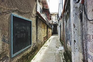 Keywords: alley lane old dirty grunge urban nobody cracks degenerate concrete disintegrated walls buildings bad condition crumbling