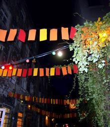Keywords: alley lane pennant flag garland celebrate celebration party joy decorate ornament high color colorful night photograph mood beautiful