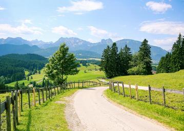 Keywords: allgäu eisenberg bavaria mountains mountain range bavarian alps alpine nature landscape forest summer idyll horizontal germany meadow trail away europe trees fence view green