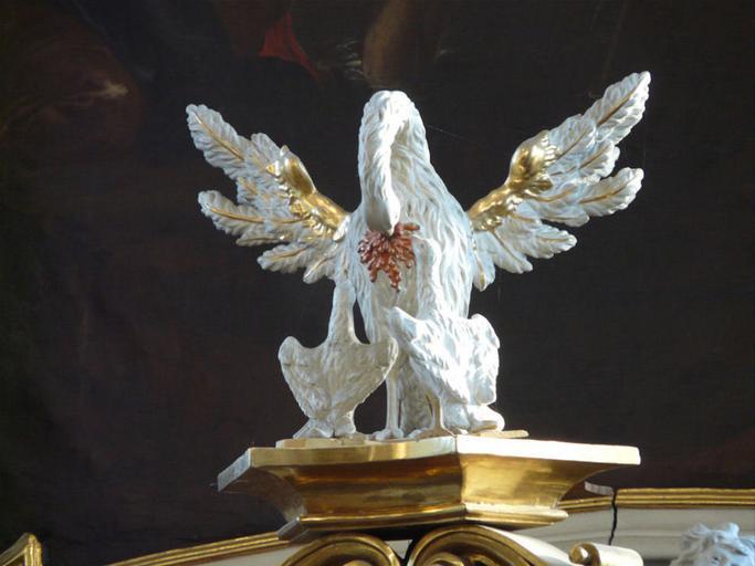 Keywords: Allmannshofen Kloster holzen 0006.JPG Kloster Holzen ist ein ehemaliges Kloster der Benediktinerinnen in Allmannshofen in Bayern in der Diözese Augsburg <br> Holzen Abbey is a Benedictine abbey near the village of Allmannshofen in Bavaria approximately 15 kilometers south of Donauwörth Germany Own Mattana 2009-04-08 Images by Mattana-Allmannshofen Germany Images by Mattana-Statues Pelican Klosterkirche St Johannes der Täufer Holzen Sculptures of pelicans in Christian art Statues of birds in Bavaria
