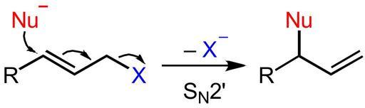 Keywords: Allylic SN2 rearrangement.svg C - en Allylic rearrangement - SN2' reaction ja アリル転位 SN2' 機構 self work with ChemDraw Su-no-G 2010-03-14 Reaction mechanisms SN2 reactions