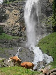 Keywords: alm cow waterfall mountains pasture livestock cliff summer