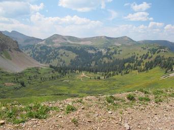 Keywords: alpine mountains rocks scree slope distant high elevation outdoors hiking camping trees forest grass natural nature travel tour up colorado san juan summer