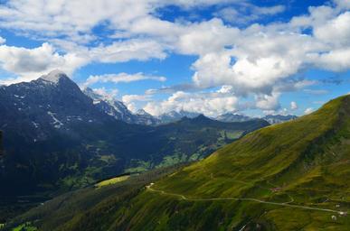 Keywords: alpine switzerland panorama eiger virgin first grindelwald grass hill mountains rock snow sky clouds blue