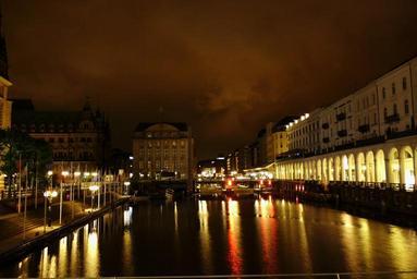 Keywords: alster arcade water night architecture skyline city cityscape tower skyscraper building view landmark urban scenic scenery downtown metropolis buildings metropolitan