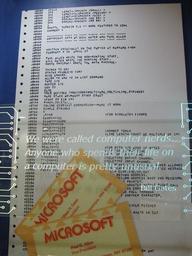 | Keywords: Altair Basic Sign.jpg The title page of the Altair BASIC source listing It shows that Paul Allen Bill Gates and Monte Davidoff wrote this version between February 9 and April 27 1975 The listing was found by Professor Harry Lewis and is now in the Harvard University library The complete listing is around 100 pages long Early text editors required the source file to have line numbers It was common practice to initially increment the lines by 10 This made it easier to insert additional lines 00200 to 00320 - Printer format 00340 - Sub Title for header on each page 00360 to 00760 - Author names and dates list of things to do 00780 to 01081 - Constant definitions partially obscured More information about the listing can be found here http //www interact-sw co uk/altair/other 20versions/ian htm The uneven vertical character alignment in this listing suggests this was printed on a drum-type line printer This is part of a large 8 foot high wall display at the entrance to the STARTUP Albuquerque and the Personal Computer Revolution wing of the New Mexico Museum of Natural History and Science The museum allows photography by visitors with no restrictions I checked with the Public Relations Manager before my visit There is only a trivial amount of source code visible and by itself would not be creative enough for a copyright Photo by Michael Holley April 2007 Taken with a Canon PowerShot A630 1/25 second and F/2 8 using existing light Listing of Altair BASIC on display at the New Mexico Museum of Natural History and Science Swtpc6800 en User Swtpc6800 Michael Holley 2007-12-22 Swtpc6800 en User Swtpc6800 Michael Holley en Wikipedia Swtpc6800 <gallery> File New Mexico Museum Natural History and Science Startup jpg </gallery> previous interwiki source http //en wikipedia org/wiki/File Altair_Basic_Sign jpg en User Swtpc6800 Altair 8800 Micro Instrumentation and Telemetry Systems New Mexico Museum of Natural History and Science Photographs by User Swtpc6800 Bill Gates |