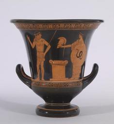 | Keywords: Altamura Painter - Red-Figure Calyx Krater - Walters 48262 - Side A.jpg The scene on this krater depicts another milestone in the life of a young man At the culmination of years of training a warrior stands beside the family altar preparing to leave for war He wears a short tunic under a cuirass breastplate and holds his spear in his left hand A young woman on the right readies his shield and stretches out her hand to pass his helmet across the altar A krater is a large wide-mouth vessel used for mixing water and wine; if the handles are in the low position seen here it is called a calyx krater between 470 460 BC Classical terracotta cm 35 9 35 8 accession number 48 262 8994 Thomas B Clarke New York until 1925 Thomas B Clarke Sale American Art Gallery New York January 7-10 1925 no 625 Henry Walters city Baltimore Walters Art Museum Henry Walters Acquired by Henry Walters 1925 Heroes Mortals and Myths in Ancient Greece The Walters Art Museum Baltimore; Frist Center for the Visual Arts Nashville; San Diego Museum Of Art San Diego; Alexander S Onassis Public Benefit Foundation USA New York 2009-2011 place of origin Athens Greece Walters Art Museum license Ancient Greek red-figure pottery in the Walters Art Museum Altamura Painter Media contributed by the Walters Art Museum needs category review Media contributed by the Walters Art Museum needs artist update |