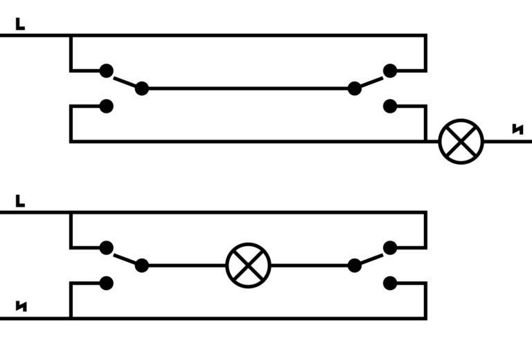 Keywords: Alternatieve wisselschakeling.svg en Alternative ways to switch a lamp from two places nl Alternatieve verboden manieren om een wisselschakeling aan te leggen own Handige Harrie 2010-07-15 3-way light switch diagrams