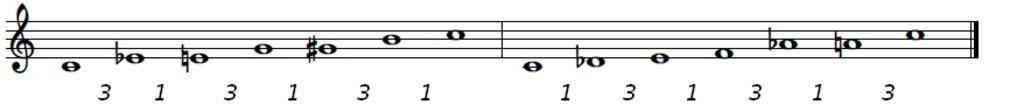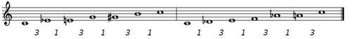 Keywords: Alternierende 6stufigkeit.PNG en Two examples for an augmented scale on C de Zwei Beispiele einer alternierenden Sechsstufigkeit auf C own Singsangsung 2012-08-06 Hexatonic musical scales