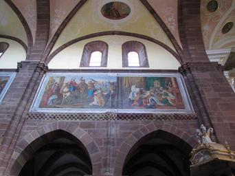 | Keywords: Altorf StCyriaque055.JPG fr Alsace Bas-Rhin Altorf Abbaye Saint-Cyriaque Détail des fresques 2011-02-23 own Rh-67 cc-by-sa-3 0 Artwork / Œuvre d'art / Kunstwerk fresco canvas 280 cm de large Abbatiale Saint-Cyriaque d'Altorf Nef IM67016964 object history Trois de ces peintures datant de la campagne de travaux des années 20-30 du 18e siècle ont été fortement restaurées et en grande partie repeintes vraisemblablement par Ignace Schott de Saverne dont on pense pouvoir reconnaître la main après leur redécouverte en 1861 lorsqu'on supprima le badigeon sur les colonnes et les pierres de taille dans la nef la quatrième près de la chaire seulement en 1878 Selon le curé Sattler elles auraient été badigeonnées à la Révolution other versions Ralph Hammann PD-old accession number Uploaded with UploadWizard Photographs of Altorf by Ralph Hammann Taken with Canon PowerShot SX20 IS Nave of Saint Cyriaque Church Altorf Frescos in Bas-Rhin Baroque frescos in Alsace 18th-century church paintings in Alsace 18th-century frescos in Alsace Altorf 19th-century church paintings in Alsace 19th-century frescos in Alsace Altorf Saint Cyriacus Details of frescos 1861 works in Alsace |
