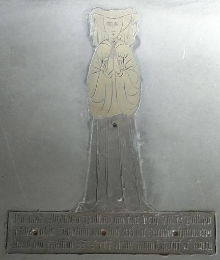 Keywords: AlyanoraPollardStGilesInTheWood.JPG Monumental brass of Alyanora Pollard d 1430 St Giles in the Wood parish church Devon Only the original lower half of the female figure has survived the top half being an accurate modern replacement with the Latin inscription below it <blockquote> Hic jacet Alyanora Pollard qui fuit uxor Joh ann is Pollard et filia Joh ann is Copleston qui obiit xxi die mensis Septembris Anno d o m in i Mill ensi mo CCCCXXX cuius animae propitietur Deus Amen http //www rootsweb ancestry com/~ukdevon/StGilesInsideMIs htm Here lies Eleanor / Alianore Pollard who was the wife of John Pollard and daughter of John Copleston who died on the 21st day of the month of September in the One thousandth four hundredth and thirtieth year of Our Lord of whose soul may God look upon with favour Amen own photo Brass 1430; photo Sept 2012 own photo Interior of St Giles in the Wood Church monuments in Devon Pollard family