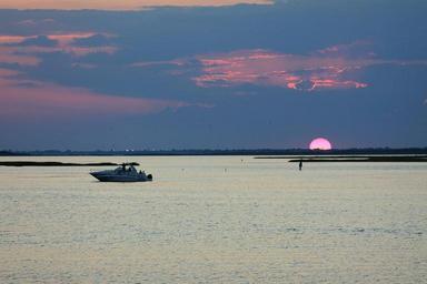 Keywords: bay ocean boat people water sunset bird clouds sky