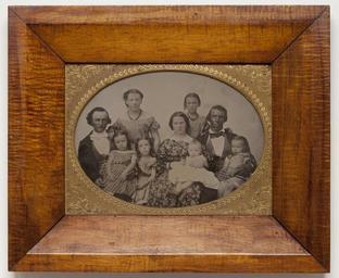 | Keywords: Ambrotype Portrait of the Brown family of Honolulu, c. 1858.jpg en Portrait of the Brown family of Honolulu full-plate ambrotype c 1858 sitters' cheeks tinted period koa wood frame A fine portrait of Captain Robert Wilcox Brown 1809-1894 and his extended family taken in Honolulu Brown was born in Ledyard CT and was a sailor on several whaling vessels In April 1850 he took his family to sea on board the North Star sailing via the Azores St Paul Island in the southern Indian Ocean Western Australia and the Timor Straits reaching Honolulu in October 1851 Brown bought a plot of land in Nuuanu Valley settled his family and continued to sail in the North Star and the Black Warrior The present photograph shows his family in Honolulu around 1858 from left his brother-in-law John Heppingstone daughters Mary Annie and Amanda wife Charlotte née Heppingstone daughters Charlotte Edith and Alura The photographer of this group portrait can only be guessed at; pioneering Hawaiian photographer Hugo Stangenwald sold his business in the spring of 1857 and it is not clear when Joseph W King started operating from the same premises An E D Durant may have been taking photographs in Honolulu in the interim Abramson Photographers of Old Hawaii Provenance a niece or nephew of Captain Brown manuscript note pasted on reverse identifying some sitters http //www bonhams com/auctions/17545/lot/5548/ uncertain 1858 Black and white photographs of families Ambrotypes Hawaii in the 1850s Hugo Stangenwald Historical images of Honolulu Hawaii PD-old Images from Bonhams |