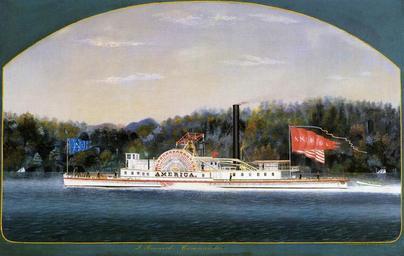 | Keywords: America (steamboat 1853).jpg en America sidewheel steamboat built 1853 oil on canvas painting by James Bard 31417 Creator James Bard 1853 Reproduced at Mariner's Museum and Peluso Anthony J Jr The Bard Brothers -- Painting America under Steam and Sail Abrams New York 1997 ISBN 0-8109-1240-6 page 50 PD-old-100-1923 James Bard 1851-1860 works America ship 1853 |