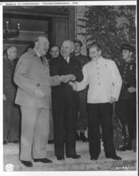 | Keywords: American and Allied leaders at international conferences - NARA - 292628.jpg Scope and content In a triple handshake U S President Harry S Truman holds hands of British Prime Minister Winston Churchill and Soviet Premier Josef Stalin during opening day of the Potsdam Conference Berlin Germany 07/25/45 General notes 292628 Local identifier Department of Defense Department of the Army Fort Leavenworth Kansas 09/18/1947 - NARA's Central Plains Region Kansas City NREA 400 West Pershing Road Kansas City MO 64108 other date circa 1943 1945 Record group Record Group 338 Records of U S Army Operational Tactical and Support Organizations World War II and Thereafter 1917 - 1999 Record group ARC 651 Ft Leavenworth Signal Corps Photograph Collection Equipment File compiled 1939 - 1965 Series ARC 292562 File unit File unit ARC Variant control numbers NAIL Control Number NRE-338-FTL EF -7217 5 Other versions <gallery> File American_and_Allied_leaders_at_international_conferences_-_NARA_-_292628 tif tif File American_and_Allied_leaders_at_international_conferences_-_NARA_-_292628 jpg jpg </gallery> NARA-cooperation PD-USGov Group photographs at the Potsdam Conference Churchill Stalin Truman |