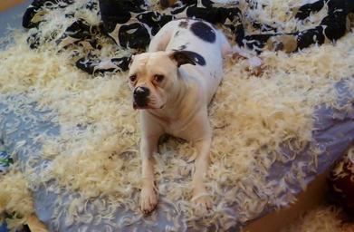 Keywords: American bulldog pillow feathers.jpg en American bulldog destroys down pillow own Djp1985 2011 Cc-zero American Bulldog