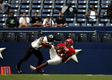| Keywords: american football action receiver player catch defense reception sideline spectators stadium game football sport helmet competition uniform athlete ball offense athletic play young football game jersey tackle watching fan texas red catching |