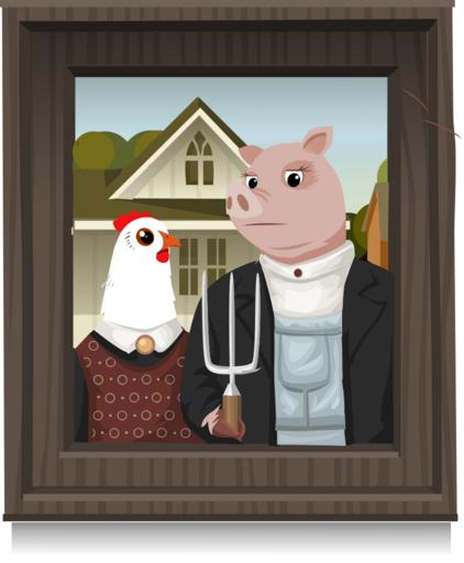 Keywords: american gothic grant wood painting hen chicken pig porcine house art parody culture pitchfork farm farmer theatre