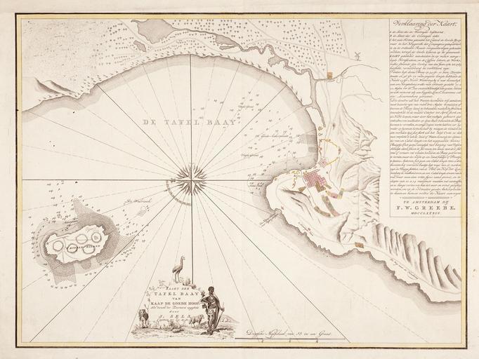 | Keywords: AMH-5095-NA Map of Table Bay.jpg Artwork nl Kaart van de Tafelbaai nl Titel in catalogus Leupe Nationaal Archief Kaart van de Tafelbaay In het midden een windroos; middenonder een cartouche versierd met een Afrikaan en enkele dieren Notities verso 184 in rood potlood en Title in Leupe catalogue National Archives Kaart van de Tafelbaay In the centre a compass; bottom centre a cartouche adorned with an African and several animals Notes on the reverse 184 in red pencil Atlas of Mutual Heritage na http //www atlasofmutualheritage nl/en/object/ id 5095 Source at the Atlas of Mutual Heritage - http //www gahetna nl/collectie/archief/inventaris/index/eadid/4 VEL/inventarisnr/184/level/file Source at the Nationaal Archief en Subjects Asians Africans banderole / cartouche / ornamentation chart / map / plan building fauna nl Onderwerpen Aziaten Afrikanen banderol / cartouche / versiering plattegrond / kaart gebouw fauna en Post this image is related to a VOC trading post called http //www atlasofmutualheritage nl/en/post/ id 320 Cape Town Inscription De Tafel Baaij author r te Amsterdam bij F W Greebe / m o door J Sels Capitein der Zee nl 1784 Creator J Sels Creator F W Greebe nl J Sels landmeter / kaartenmaker F W Greebe uitgever en J Sels land surveyor / mapmaker F W Greebe publisher Institution Nationaal Archief nl koperdruk op papier en copperplate printing on paper Size cm 54 5 75 5 accession number NL-HaNA_4 VEL_184 old number VEL0184 PD-Art-100 Maps of the Dutch East India Company - South Africa 1784 |