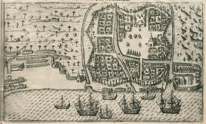 | Keywords: AMH-6643-KB De Houtman's fleet at anchor near Bantam.jpg Artwork nl De vloot van De Houtman voor anker bij Bantam in 1596 nl De vloot van De Houtman voor anker bij Bantam in 1596 Legenda ontbreekt Tijdens dit eerste bezoek aan Bantam ontstond er veel onenigheid met de Portugezen en de lokale bevolking en De Houtman's fleet at anchor off Bantam in 1596 There is no key During this first visit major discord arose with the Portuguese and the local population Atlas of Mutual Heritage kb http //www atlasofmutualheritage nl/en/object/ id 6643 Source at the Atlas of Mutual Heritage en Subjects ship / vessel bird's-eye view / elevation elevation / bird's-eye view chart / map / plan anchorage / pier / harbour building mosque bridge flora fence / kraal house nl Onderwerpen schip / vaartuig vogelvlucht / opstand opstand / vogelvlucht plattegrond / kaart rede / haven / pier gebouw moskee brug flora omheining / kraal huis / woonhuis circa 1598 Creator Cornelis Claesz nl Cornelis Claesz uitgever Anoniem / Anonymous graveur / etser en Cornelis Claesz publisher Anoniem / Anonymous engraver / etcher Institution Koninklijke Bibliotheek nl gravure op papier en engraving on paper Size cm 26 15 5 accession number 1700 C 2 voor p 38 PD-Art-100 Maps of the Dutch East India Company - Indonesia 1598 |