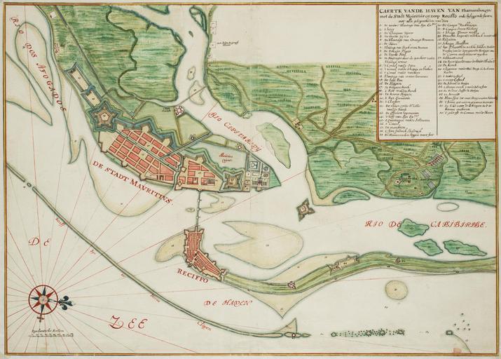 | Keywords: AMH-6777-NA Map of the harbour at Pernambuco.jpg Artwork nl Kaart van de haven van Pernambuco nl Titel catalogus Leupe NA Caerte van de haven van Pharnamboeque met de stadt Mouritius en dorp Reciffo ende bijleggende forten Met loodingen Kaart van de haven van Pernambuco Caerte van de haven van Pharnambocquc met de Stadt Mouritius en Dorp Reciffo ende bijleggende forten met alle gelegentheden van dien Legenda 1 De nieuwe Plantage van Sijn Ex tei / 2 t huijs / 3 De Cleeijnne vijver / 4 De Groote vijver / 5 De Plantage van Orange Boomen / 6 De Tuijnen / 7 Plantage van Backovens Boomen / 8 De Pickoeur Plaets / 9 De Paerde Stal / 10 De Huijsingen daer de opsichter vande Plantage woont / 11 't Corael vande Ossen / 12 't Corael van de schapen en bocken / 13 t Corael vande varckens / 14 Plantage van de waterlimoenen / 15 De Sout Pan / 16 De Sluijsen / 17 De konijnen Berch / 18 't Fort waeden Berch / 19 De Boeren Huijsen / 20 't Fort Erenestus / 21 't Clooster / 22 De thuyn vande H r Codde van der Burch / 23 De Officiers logementen / 24 't hoff van sijn Ex cie / 25 t Quartieren vande Soldaeten / 26 t Canel / 27 De marckten / 28 't fort fredrick Hendrick / 29 De Hoornwercken leggen voort fort / 30 De Compa Packhuysen / 31 De Compes Broot Backerij / 32 t Scheeps Timmer werff / 33 Droochte loopende met hooch water ond / 34 Redouten / 35 Scheeps Hoofden / 36 Syn Plaetsen de welcke sullen Breder weesen dan de doorgaende Brugge om de Carren malcander te wycken / 37 Pallesaetwerck / 38 De Poort Gaende naer de Stadt Olinda / 39 De kerck / 40 t logement vande Heer Hooge en seckreten Raeden / 41 t water Casteel / 42 t Watter Casteel / 43 De Schans de Bruijn / 44 t Hooren werck voor 't Selve fort / 45 De Redout Juffr de Bruyn / 46 De Strandt / 47 Morassen die met Hoog watter bedeck sijn / 48 't france gat anders genaemt Barretto / 49 De Poort waer de Scheepen in 't in komen anckeren / 50 't gadt oft in Commen van de Haven Bijzonderheden de kaart maakt deel uit van de Atlas Vingboons Cf Nationaal Archief Den Haag inv nr VEL0711 en VEL0712 Koninklijke Bibliotheek 1043 B 14 na p 136 no 33 en Rijksmuseum Amsterdam inv nr NG-20-D en Title in the Leupe catalogue NA Caerte van de haven van Pharnamboeque met de stadt Mouritius en dorp Reciffo ende bijleggende forten Met loodingen Map of the harbour at Pernambuco Caerte van de haven van Pharnambocquc met de Stadt Mouritius en Dorp Reciffo ende bijleggende forten met alle gelegentheden van dien Key 1 De nieuwe Plantage van Sijn Ex tei / 2 t huijs / 3 De Cleeijnne vijver / 4 De Groote vijver / 5 De Plantage van Orange Boomen / 6 De Tuijnen / 7 Plantage van Backovens Boomen / 8 De Pickoeur Plaets / 9 De Paerde Stal / 10 De Huijsingen daer de opsichter vande Plantage woont / 11 't Corael vande Ossen / 12 't Corael van de schapen en bocken / 13 t Corael vande varckens / 14 Plantage van de waterlimoenen / 15 De Sout Pan / 16 De Sluijsen / 17 De konijnen Berch / 18 't Fort waeden Berch / 19 De Boeren Huijsen / 20 't Fort Erenestus / 21 't Clooster / 22 De thuyn vande H r Codde van der Burch / 23 De Officiers logementen / 24 't hoff van sijn Ex cie / 25 t Quartieren vande Soldaeten / 26 t Canel / 27 De marckten / 28 't fort fredrick Hendrick / 29 De Hoornwercken leggen voort fort / 30 De Compa Packhuysen / 31 De Compes Broot Backerij / 32 t Scheeps Timmer werff / 33 Droochte loopende met hooch water ond / 34 Redouten / 35 Scheeps Hoofden / 36 Syn Plaetsen de welcke sullen Breder weesen dan de doorgaende Brugge om de Carren malcander te wycken / 37 Pallesaetwerck / 38 De Poort Gaende naer de Stadt Olinda / 39 De kerck / 40 t logement vande Heer Hooge en seckreten Raeden / 41 t water Casteel / 42 t Watter Casteel / 43 De Schans de Bruijn / 44 t Hooren werck voor 't Selve fort / 45 De Redout Juffr de Bruyn / 46 De Strandt / 47 Morassen die met Hoog watter bedeck sijn / 48 't france gat anders genaemt Barretto / 49 De Poort waer de Scheepen in 't in komen anckeren / 50 't gadt oft in Commen van de Haven Remarks the chart is contained in the Vingboons Atlas Cf Nationaal Archief The Hague inv nr VEL0711 and VEL0712 Koninklijke Bibliotheek 1043 B 14 after p 136 no 33 and inv nr NG-20-D Atlas of Mutual Heritage na http //www atlasofmutualheritage nl/en/object/ id 6777 Source at the Atlas of Mutual Heritage - http //www gahetna nl/collectie/archief/inventaris/index/eadid/4 VELH/inventarisnr/619 74/level/file Source at the Nationaal Archief en Subjects compass / dial chart / map / plan key fortification building bridge church / parsonage menagerie / stable bazaar / market shipyard warehouse cemetery / graveyard nl Onderwerpen kompas / windroos plattegrond / kaart legenda vesting gebouw brug kerk / pastorie menagerie / stal bazaar / markt scheeps- / timmerwerf pakhuis begraafplaats / kerkhof en Post this image is related to a WIC trading post called http //www atlasofmutualheritage nl/en/post/ id 1040 Boavista Inscription Caerte van de haven van Pharnambocquc met de Stadt Mouritius en Dorp Reciffo ende bijleggende forten met alle gelegentheden van dien nl circa 1665 Creator Johannes Vingboons nl Johannes Vingboons landmeter / kaartenmaker en Johannes Vingboons land surveyor / mapmaker Institution Nationaal Archief nl aquarel/waterverf op papier en watercolour on paper Size cm 47 67 accession number NL-HaNA_4 VELH_619 74 old number VELH0619 74 PD-Art-100 Maps of the West-Indische Compagnie 1665 |