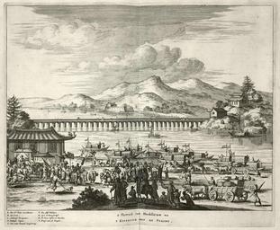 | Keywords: AMH-6846-KB The Dutch delegation led by Van Hoorn leaves Hocksieuw.jpg Artwork nl De Nederlandse delegatie van Van Hoorn vertrekt uit Hocksieuw nl De Nederlandse delegatie van Van Hoorn vertrekt uit Hocksieuw t Vertreck van Hocksieuw na t Kyserlyck hof tot Peking Legenda A Den H r Pieter van Hooren / B Syn Soon / C Hollantse Trompetters / D Packasie Wagens / E Den Onder Koninck Singlamong / F Des self Palakyn / G Syn vordere gevolgh / H De Twee Ossen en Paerden I Brugh met 36 Boogen De reis van Pieter van Hoorn naar het keizerlijk hof in China vond plaats in 1662-1663 Dr Olfert Dapper 1636-1689 publiceerde na 1663 een groot aantal boeken Hij schreef een geschiedenis van de stad Amsterdam en verzorgde de eerste Nederlandse vertaling van Herodotus Hij is echter vooral bekend vanwege zijn vele beschrijvingen van vreemde landen die hij uit verschillende bronnen samenstelde zonder dat hij de landen waarover hij schreef ooit zag Dit stadsgezicht op Hochsieu is afkomstig uit een beschrijving van het Chinese keizerrijk De uitgever van dit boek Jacob van Meurs was ook graveur Het is echter niet zeker of hij ook de graveur van deze prenten was of imperial China The publisher of this volume Jacob van Meurs was also an engraver However it is not certain whether he was the engraver of these prints Atlas of Mutual Heritage kb http //www atlasofmutualheritage nl/en/object/ id 6846 Source at the Atlas of Mutual Heritage en Subjects Person European Asians Africans survey / view flora bridge building ship / vessel meeting / visit key nl Onderwerpen Persoon Europeanen Aziaten Afrikanen overzicht / aanzicht flora brug gebouw schip / vaartuig ontmoeting / bezoek legenda en Post this image is related to a VOC trading post called http //www atlasofmutualheritage nl/en/post/ id 701 Fuzhou Inscription t Vertreck van Hocksieuw na t Kyserlyck hof tot Peking nl circa 1670 Creator Jacob van Meurs nl Anoniem / Anonymous graveur / etser Jacob van Meurs uitgever en Anoniem / Anonymous engraver / etcher Jacob van Meurs publisher Institution Koninklijke Bibliotheek nl gravure op papier en engraving on paper Size cm 30 36 accession number 388 A 5 deel I na p 280 PD-Art-100 Dutch East India Company 1670 |