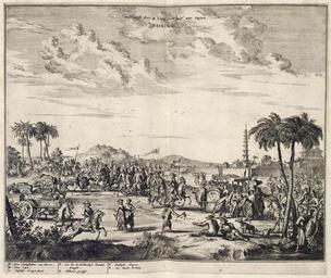 | Keywords: AMH-6847-KB The Dutch delegation led by Van Hoorn is welcomed half an hour outside Peking.jpg Artwork nl De Nederlandse delegatie van Van Hoorn wordt een half uur buiten Peking verwelkomd nl De Nederlandse delegatie van Van Hoorn wordt een half uur buiten Peking verwelkomd Welkomst door de Lipu een half uur buijten Pecking Legenda A Den Ambassadeur van Hoorn / B Den Lipu / C Desselfs Draegh-seetel / D Een die de Hollandtse Vaendel draeght / E Hollants gevolgh / F Packasie Wagens / G De Stadt Pecking De reis van Pieter van Hoorn naar het keizerlijk hof in China vond plaats in 1662-1663 Dr Olfert Dapper 1636-1689 publiceerde na 1663 een groot aantal boeken Hij schreef een geschiedenis van de stad Amsterdam en verzorgde de eerste Nederlandse vertaling van Herodotus Hij is echter vooral bekend vanwege zijn vele beschrijvingen van vreemde landen die hij uit verschillende bronnen samenstelde zonder dat hij de landen waarover hij schreef ooit zag Deze afbeelding is afkomstig uit een beschrijving van het Chinese keizerrijk De uitgever van dit boek Jacob van Meurs was ook graveur Het is echter niet zeker of hij ook de graveur van deze prenten was of imperial China The publisher of this volume Jacob van Meurs was also an engraver However it is not certain whether he was the engraver of these prints Atlas of Mutual Heritage kb http //www atlasofmutualheritage nl/en/object/ id 6847 Source at the Atlas of Mutual Heritage en Subjects survey / view meeting / visit building Person European Asians Africans fauna tower key nl Onderwerpen overzicht / aanzicht ontmoeting / bezoek gebouw Persoon Europeanen Aziaten Afrikanen fauna toren legenda Inscription Welkomst door de Lipu een half uur buijten Pecking nl circa 1670 Creator Jacob van Meurs nl Anoniem / Anonymous graveur / etser Jacob van Meurs uitgever en Anoniem / Anonymous engraver / etcher Jacob van Meurs publisher Institution Koninklijke Bibliotheek nl gravure op papier en engraving on paper Size cm 30 36 accession number 388 A 5 deel I na p 346 PD-Art-100 Dutch East India Company 1670 |