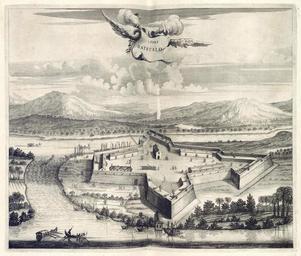 | Keywords: AMH-6965-KB Bird's eye view of the fort of Batecalo.jpg Artwork nl Vogelvlucht van het fort Batecalo nl Vogelvlucht van het fort Batecalo t Fort Batecalo Aanzicht op het fort met op de achtergrond bergen Het fort wordt omgeven door een gracht en ligt in de kom van een rivier Cf Nationaal Archief inv nr VELH 619 25 en Bird's eye view of the fort of Batecalo t Fort Batecalo View of the fort with mountains in the background The fort is surrounded by a moat and lies in the basin of a river Cf Nationaal Archief inv nr VELH 619 25 Atlas of Mutual Heritage kb http //www atlasofmutualheritage nl/en/object/ id 6965 Source at the Atlas of Mutual Heritage en Subjects bird's-eye view / elevation elevation / bird's-eye view survey / view fortification banderole / cartouche / ornamentation flora ship / vessel building nl Onderwerpen vogelvlucht / opstand opstand / vogelvlucht overzicht / aanzicht vesting banderol / cartouche / versiering flora schip / vaartuig gebouw en Post this image is related to a VOC trading post called http //www atlasofmutualheritage nl/en/post/ id 434 Batticaloa Inscription 't Fort Batecalo nl circa 1672 Creator Johannes Janssonius Waasbergen nl Anoniem / Anonymous graveur / etser Johannes Janssonius Waasbergen uitgever en Anoniem / Anonymous engraver / etcher Johannes Janssonius Waasbergen publisher Institution Koninklijke Bibliotheek nl koperdruk op papier en copperplate printing on paper Size cm 30 5 35 5 accession number 189 A 6 deel II na p 54 PD-Art-100 Dutch East India Company 1672 |