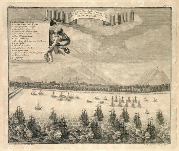 Keywords: AMH-7015-KB View of Batavia.jpg Artwork nl Gezicht op Batavia nl Gezicht op Batavia in spiegelbeeld weergegeven Ein Prospect der Stadt Batavia wie sich dieselbe von der Reede oder dem Hafen praesentiret Legenda a Das Blaue Gebirge / b Hafen oder die Reede / c Europaeische-Schiffe / e Morische-Fahr Zeuge / f Die Hollaendische Kirche / g Der Flaggenstock / h Das Rathhauß / i Des General Gouverneurs Wohnung / k Das Castel / l Das Bastion Perl / m Das Bastion Saphier / n Der Läger-Stall / o Pfale welche in die See geschlagen / p Wasser-Port / q Magazyns / r Busgage Linksboven Num I en View of Batavia rendered as a mirror image Ein Prospect der Stadt Batavia wie sich dieselbe von der Reede oder dem Hafen praesentiret Key a Das Blaue Gebirge / b Hafen oder die Reede / c Europaeische-Schiffe / e Morische-Fahr Zeuge / f Die Hollaendische Kirche / g Der Flaggenstock / h Das Rathhauß / i Des General Gouverneurs Wohnung / k Das Castel / l Das Bastion Perl / m Das Bastion Saphier / n Der Läger-Stall / o Pfale welche in die See geschlagen / p Wasser-Port / q Magazyns / r Busgage Top left Num I Atlas of Mutual Heritage kb http //www atlasofmutualheritage nl/en/object/ id 7015 Source at the Atlas of Mutual Heritage en Subjects survey / view banderole / cartouche / ornamentation key ship / vessel building anchorage / pier / harbour church / parsonage fortification government building / residence assembly hall / town hall gate nl Onderwerpen overzicht / aanzicht banderol / cartouche / versiering legenda schip / vaartuig gebouw rede / haven / pier kerk / pastorie vesting gouvernementshuis / -gebouw raadhuis / stadhuis poort en Post this image is related to a VOC trading post called http //www atlasofmutualheritage nl/en/post/ id 328 Jakarta Inscription Ein Prospect der Stadt Batavia wie sich dieselbe von der Reede oder dem Hafen praesentiret author I W Heydt ad Viv del 1737 / I M Seeligmann sculpsit nl 1737 Creator Johann Wolfgang Heydt Creator I M Seeligmann Creator Johann Carl Tetschner nl Johann Wolfgang Heydt tekenaar I M Seeligmann graveur / etser Johann Carl Tetschner uitgever en Johann Wolfgang Heydt draughtsman I M Seeligmann engraver / etcher Johann Carl Tetschner publisher Institution Koninklijke Bibliotheek nl koperdruk op papier en copperplate printing on paper Size cm 25 5 29 accession number 2102 A 7 p 1 PD-Art-100 Dutch East India Company 1737