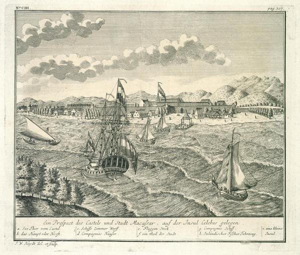 Keywords: AMH-7110-KB View of the city and the fort of Macassar.jpg Artwork nl Gezicht op de stad en het fort Macassar nl Gezicht op de stad en het fort Macassar Ein Prospect des Castels und Stadt Macassar auf der Insul Celebes gelegen Linksboven No CIII Rechtsboven pag 307 Legenda a See Thor vom Castel / b das Haupt oder Hooft / c Schiffs Zimmer Werff / d Compagnies Häuser / e Flaggen Stock / f ein theil der Stadt / g Compagnie Schiff / h Inländischer Fischer Fahrzeug / i eine kleine Insul en View of the city and the fort of Macassar Ein Prospect des Castels und Stadt Macassar auf der Insul Celebes gelegen Linksboven No CIII Rechtsboven pag 307 Legenda a See Thor vom Castel / b das Haupt oder Hooft / c Schiffs Zimmer Werff / d Compagnies Häuser / e Flaggen Stock / f ein theil der Stadt / g Compagnie Schiff / h Inländischer Fischer Fahrzeug / i eine kleine Insul Atlas of Mutual Heritage kb http //www atlasofmutualheritage nl/en/object/ id 7110 Source at the Atlas of Mutual Heritage en Subjects survey / view anchorage / pier / harbour ship / vessel key fortification house shipyard gate Person building nl Onderwerpen overzicht / aanzicht rede / haven / pier schip / vaartuig legenda vesting huis / woonhuis scheeps- / timmerwerf poort Persoon gebouw en Post this image is related to a VOC trading post called http //www atlasofmutualheritage nl/en/post/ id 344 Makassar Inscription Ein Prospect des Castels und Stadt Macassar auf der Insul Celebes gelegen author J W Heydt del et sculp nl between 1735 1744 Creator Johann Carl Tetschner Creator Johann Wolfgang Heydt nl Johann Carl Tetschner uitgever Johann Wolfgang Heydt tekenaar en graveur en Johann Carl Tetschner publisher Johann Wolfgang Heydt draughtsman and engraver Institution Koninklijke Bibliotheek nl koperdruk op papier en copperplate printing on paper Size cm 24 5 29 accession number 2102 A 7 p 307 PD-Art-100 Dutch East India Company 1730s